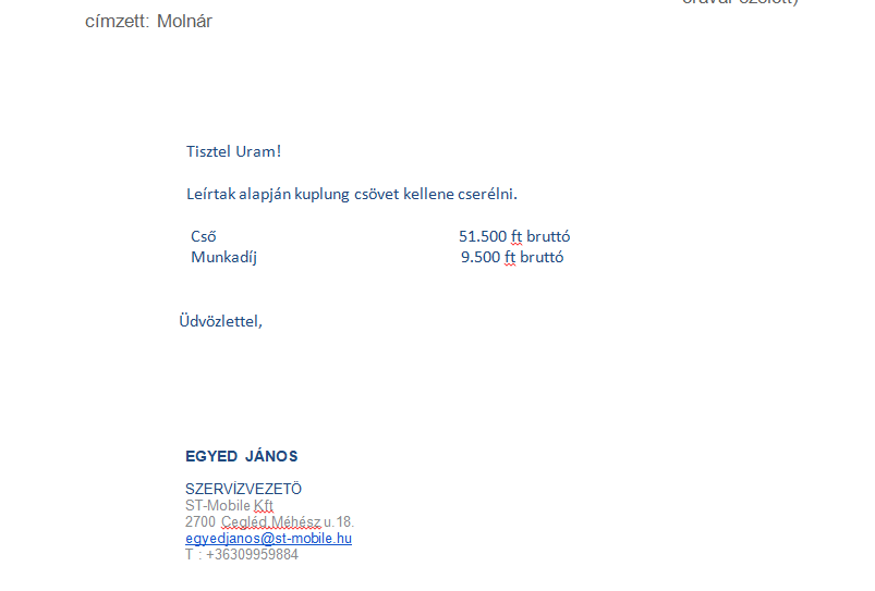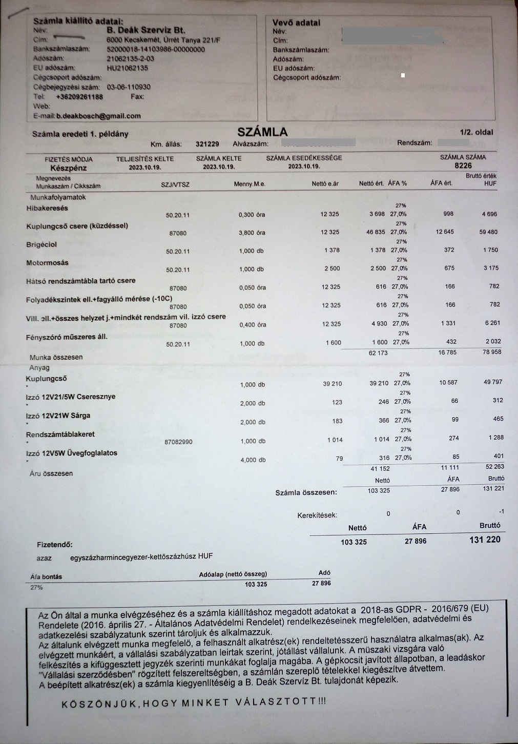 Számla összege : 131.000.-Ft Némi alkudozás után,mert az eredeti számla összeg 150.000.-ft volt.