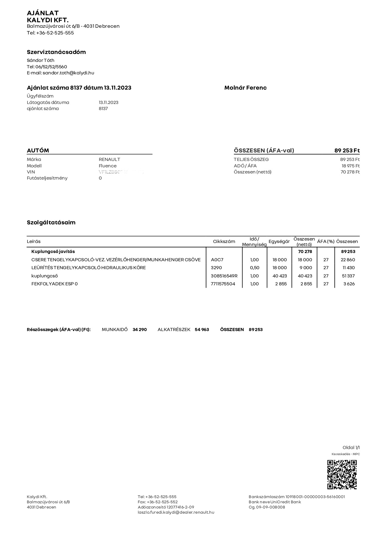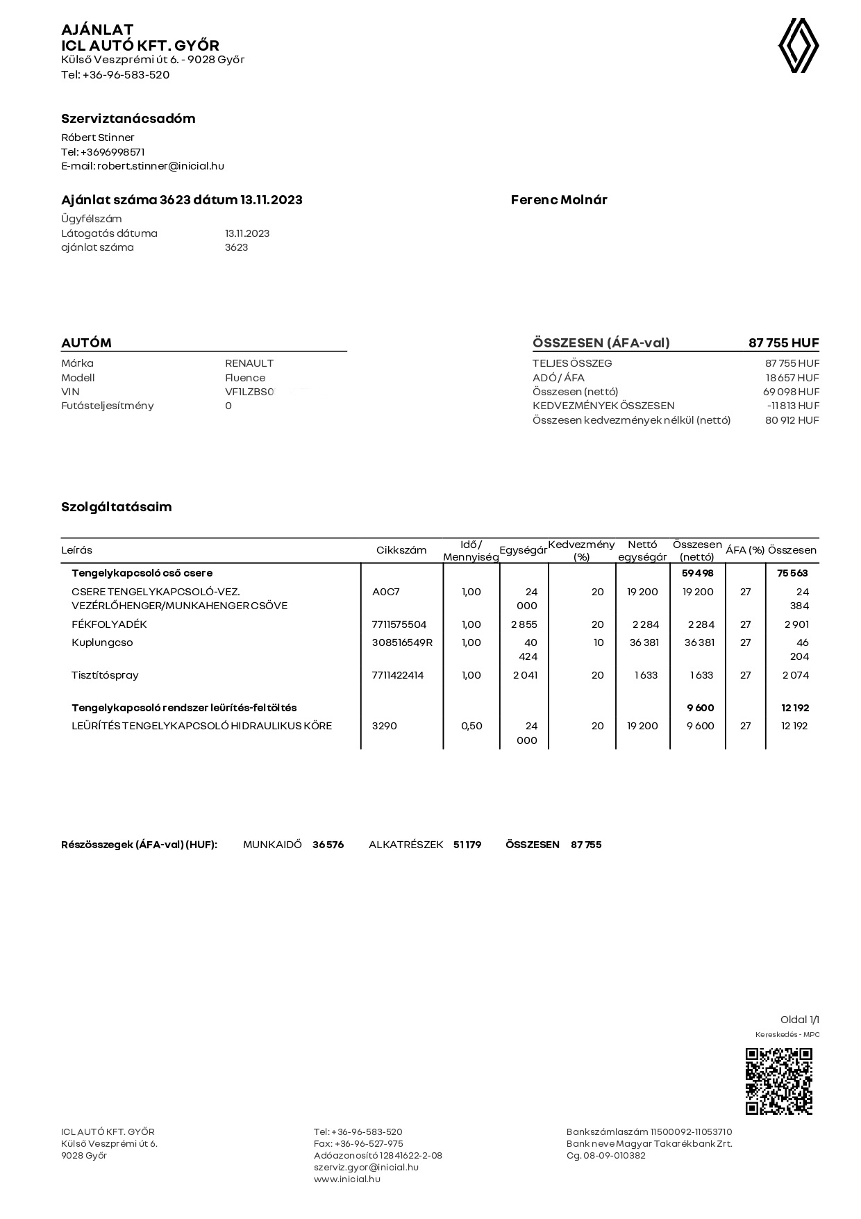 ICL Renault Győr, ajánlati összeg : 87.755.-ft